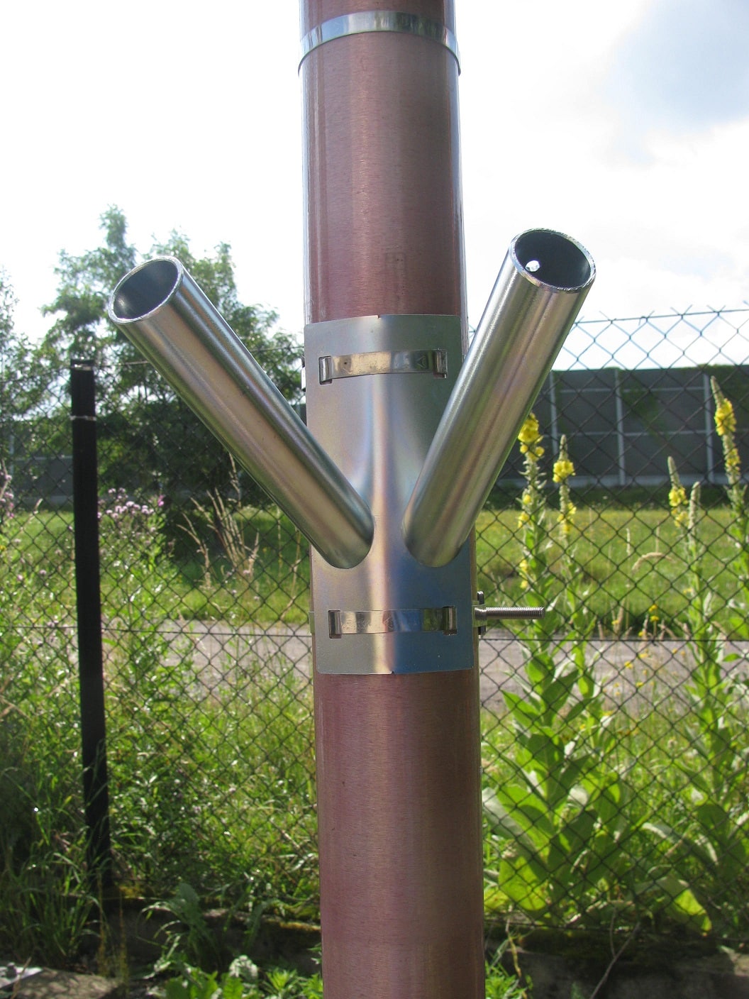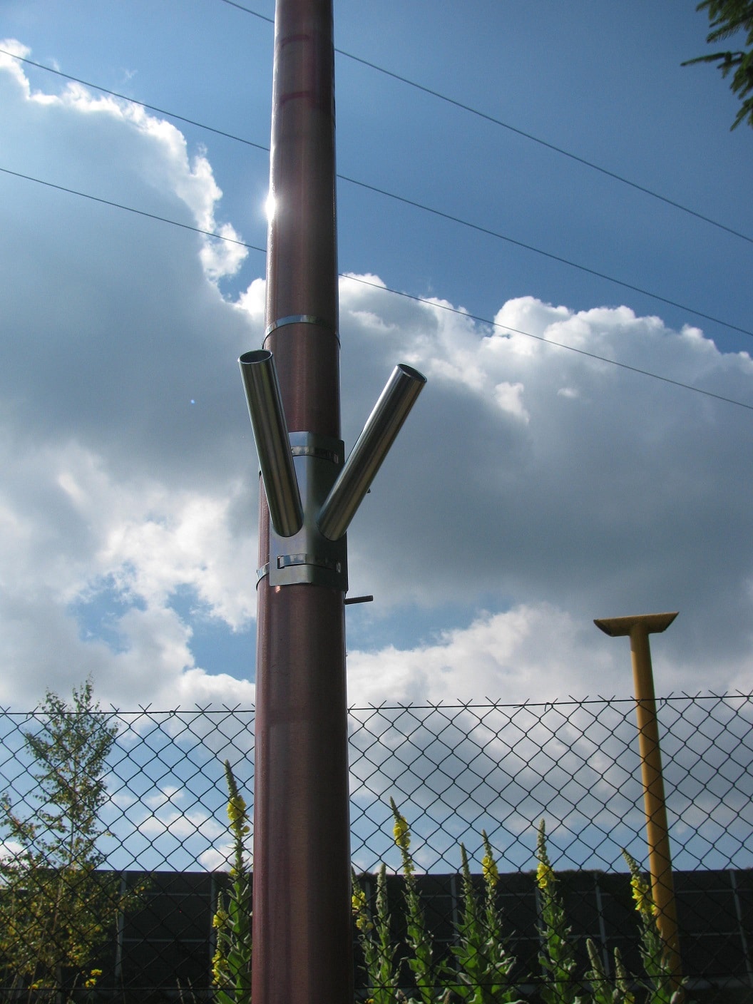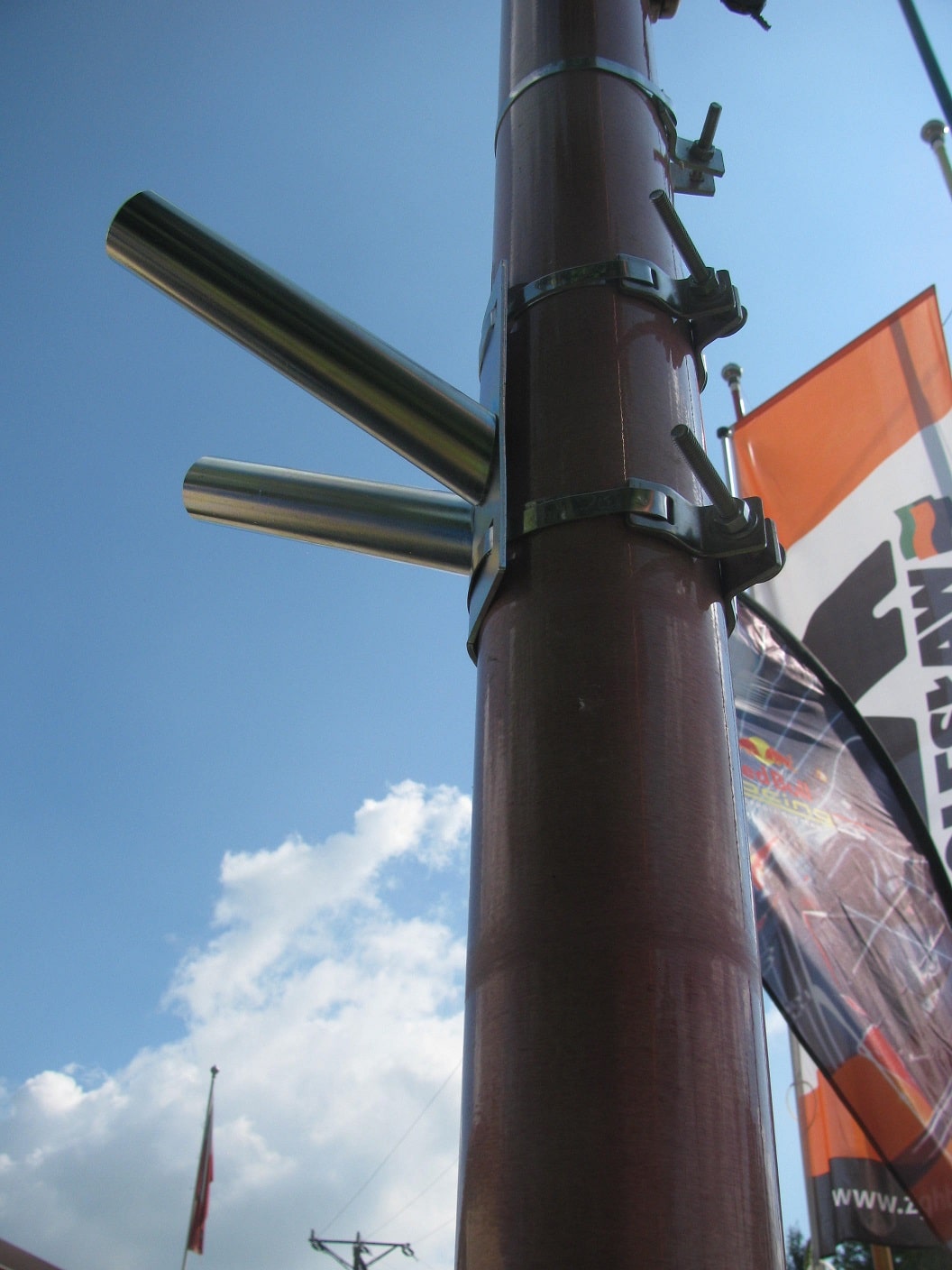 5. Fix the flag support to the pole or lamp post, tighten the clamps with the clamping pieces inserted in the mounting brackets and tighten the nuts with a wrench. After mounting the flag-holder bracket, the flagpoles are attached to the brackets and secured with screws.