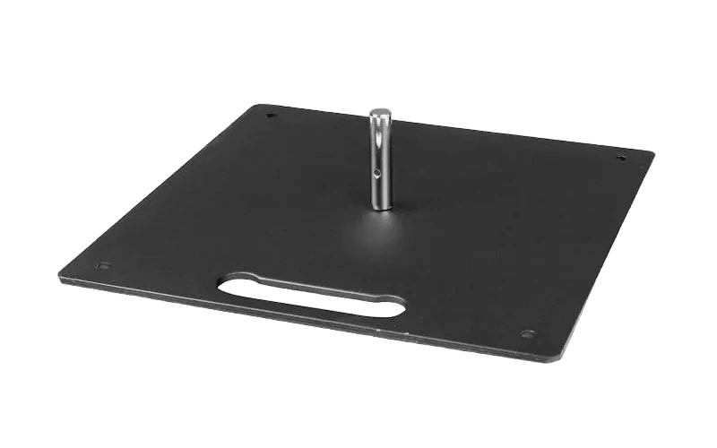 Black steel square base 4 kg. For indoor and outdoor use. Hole in each corner for anchoring with sardines (not forged) or rubber feet.